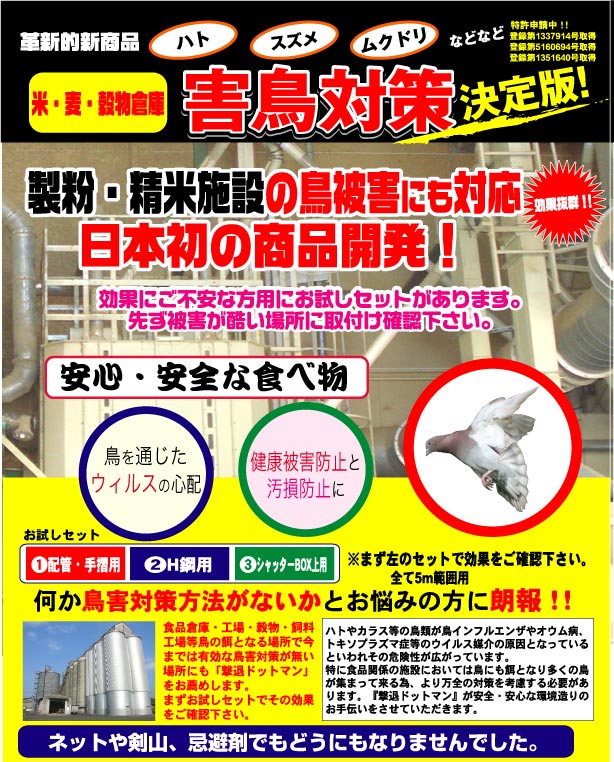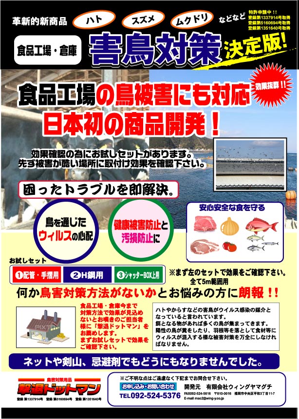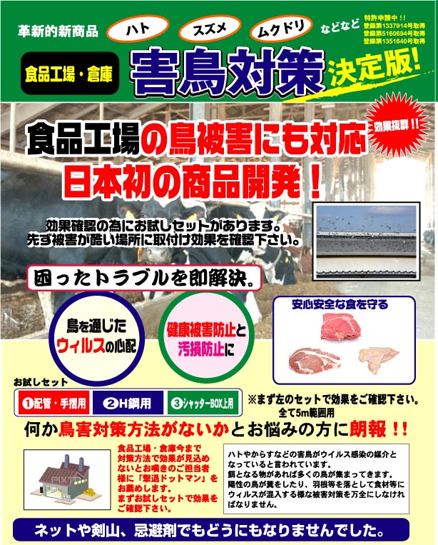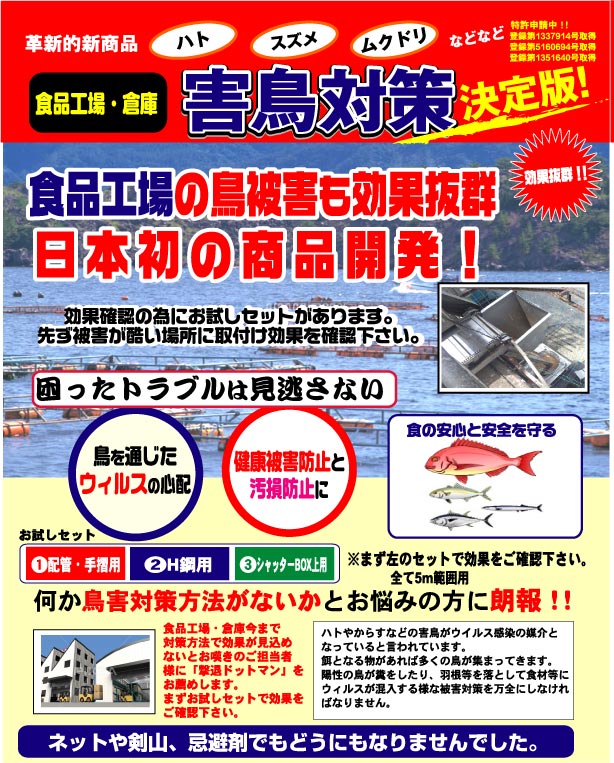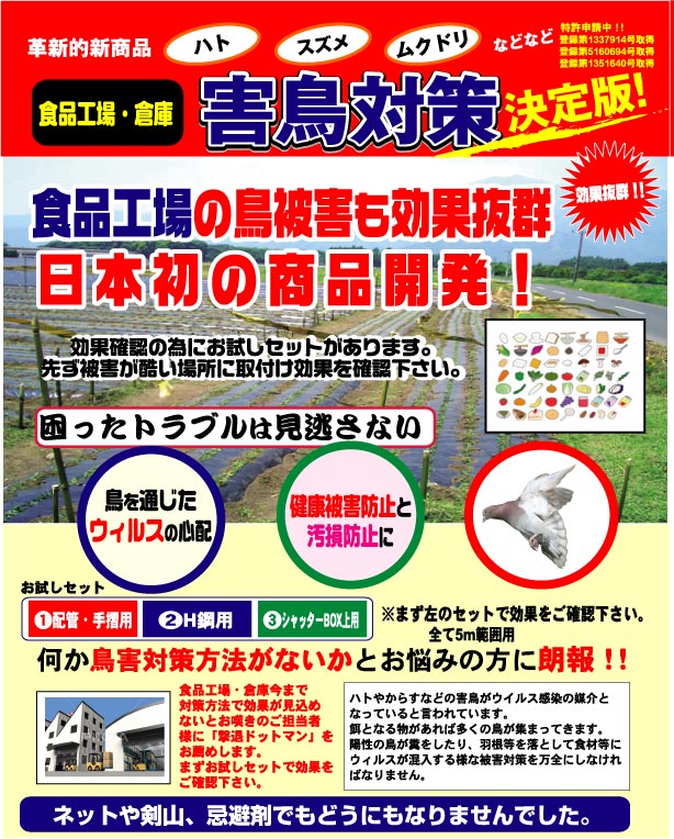 カラスやハトからの被害に困っている方のために開発した、鳥害対策商品です。