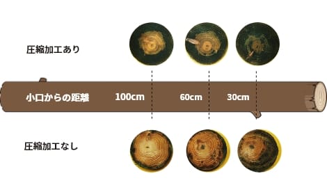 角材には「インサイジング」、丸材には「圧縮」によって前加工をすることで無加工材に比べ浸潤度を飛躍的に上昇させることができる