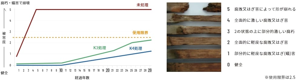独立行政法人森林総合研究所において、ACQ処理した木杭で屋外暴露試験を行い、その効果は29年間を経過しても良好です。